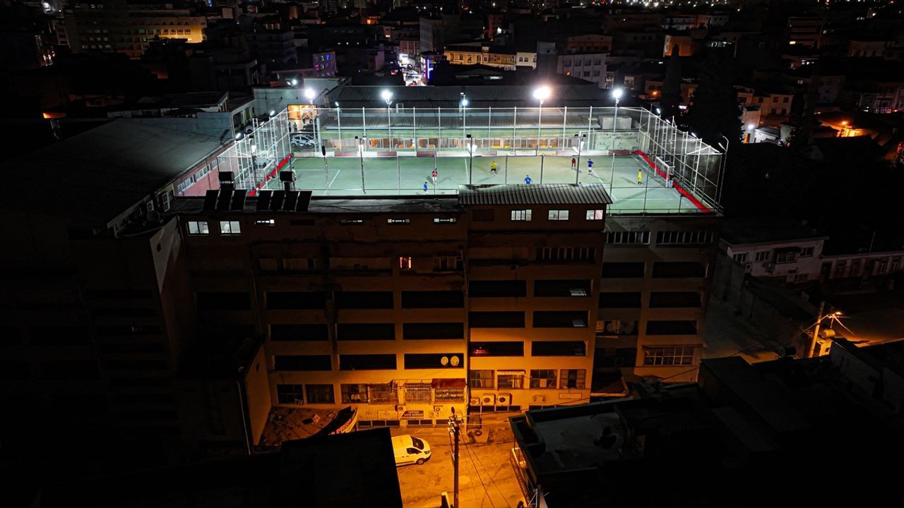 Adana'da 5 katlı bir binanın çatısında yer alan halı saha, serin havada ve kent manzarası eşliğinde maç yapma imkanı sunuyor.