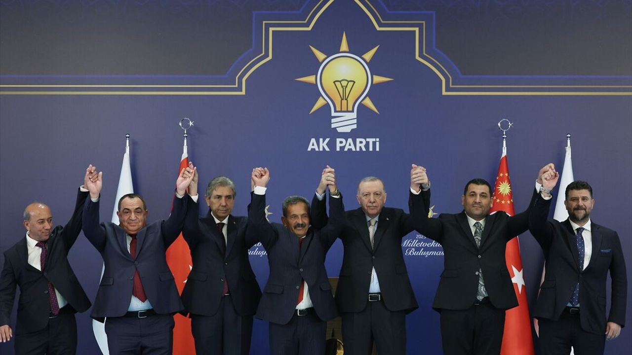 Cumhurbaşkanı Recep Tayyip Erdoğan, AK Parti Genel Merkezi’nde düzenlenen grup toplantısının ardından, AK Parti’ye geçen 7 belediye başkanına rozetlerini taktı.