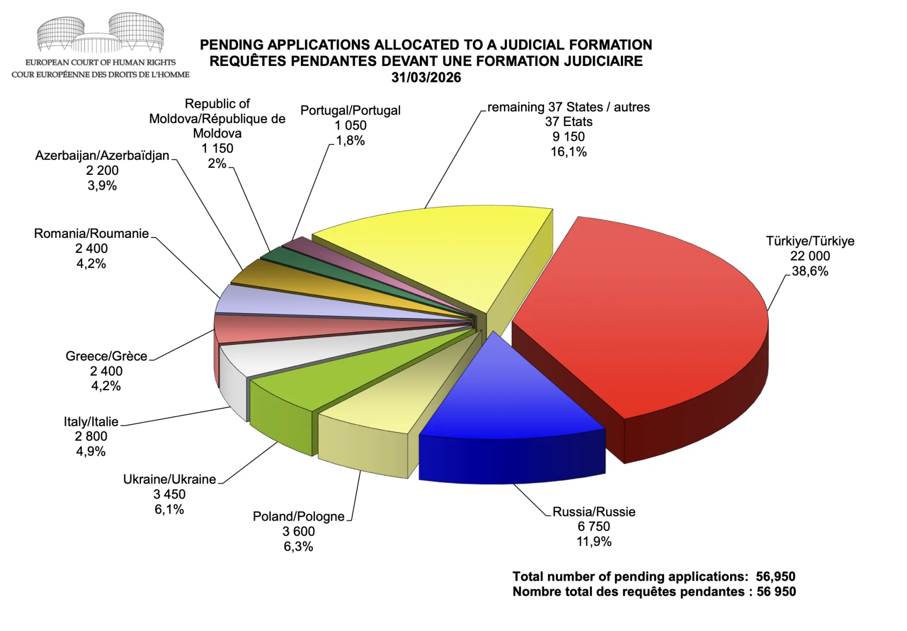 AİHM’in X hesabından yapılan paylaşıma göre, 31 Mart 2026 itibarıyla 58 bin 950 bekleyen başvuru olduğu görüldü. Portekiz, Moldova, Azerbaycan, Romanya, Yunanistan, İtalya, Ukrayna, Polonya, Türkiye ve “diğer ülkeler” olmak üzere kategorilere ayrılan başvurularda Türkiye’nin 22 bin başvuru ile birinci sırada yer aldığı görüldü.