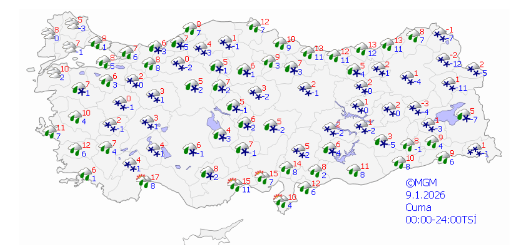 Meteoroloji Genel Müdürlüğü'nün 9 Ocak hava durumu tahmin raporu