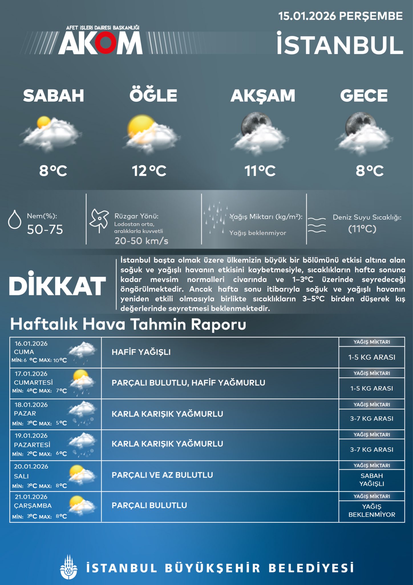 AKOM'un değerlendirmesine göre kentte 18 Ocak Pazar ve 19 Ocak Pazartesi günleri kar ve karla karışık yağmurun bekleniyor. Rapora göre İstanbul'da en düşük ve en yüksek hava sıcaklıklarının pazar günü 2 ve 5 derece, pazartesi günü ise 3 ve 6 derece olacağı öngörülüyor.