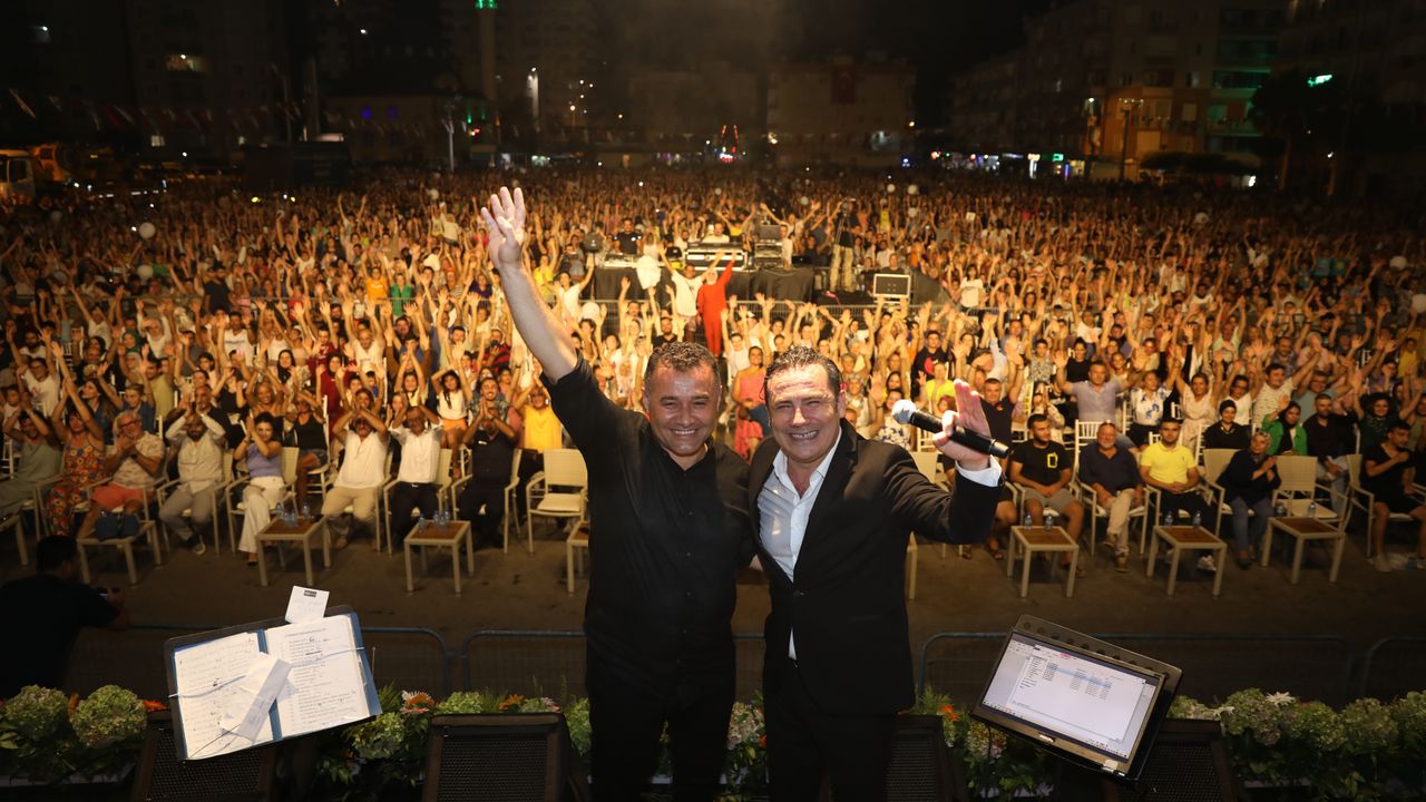 Başkan Yücel’in konuşmasının ardından sahneye çıkan Ferhat Göçer, en sevilen parçalarını Mahmutlar halkı için seslendirdi. Başkan Yücel, günün anısına Ferhat Göçer’e muz lifinden tablo ve çiçek takdim etti.