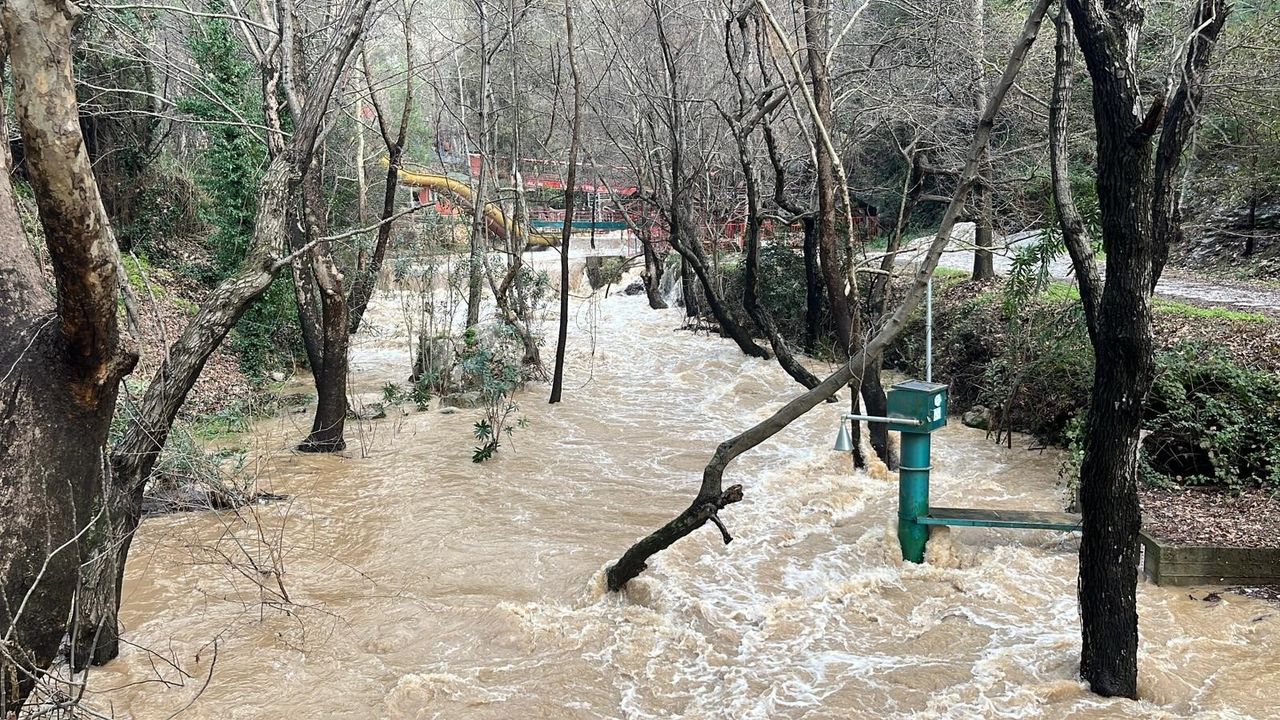 Alanya'nın Oba Mahallesi Alacami çevresinde dün akşam etkili olan sağanak yağışın ardından Oba Çayı taştı. Kısa sürede debisi yükselen çayın taşmasıyla birlikte dere yatağına yakın iki işletmeye ait çardaklar sular altında kaldı. İşletmelerde hasar meydana gelirken, yaşanan su baskını dron ile görüntülendi.