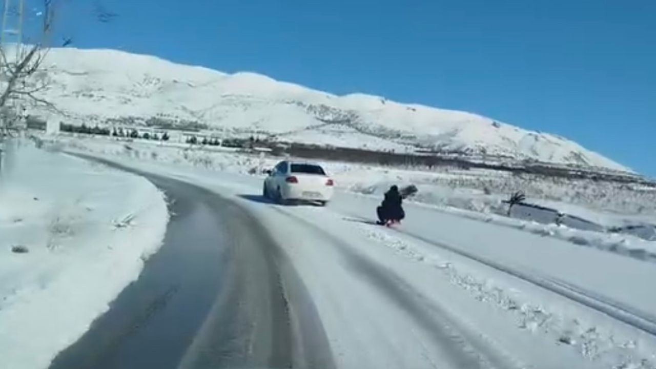 Olay, Baskil ilçesi Doğancık köyünde meydana geldi. Edinilen bilgiye göre, bir şahıs kazağı araca bağlayarak çekmeye başladı. Kızağın üzerindeki şahıs ise kayarak eğlendi. Tehlikeli eğlence cep telefonu kamerasına yansıdı.