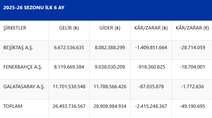 Yaklaşık 26,5 milyar liralık gelire ulaşan kulüplerin giderleri 28,9 milyar lirayı aştı. Böylece üç büyükler, bu sezonun 1 Haziran-30 Kasım arasını kapsayan ilk 6 ayını, 2 milyar 415 milyon liralık zararla kapattı.