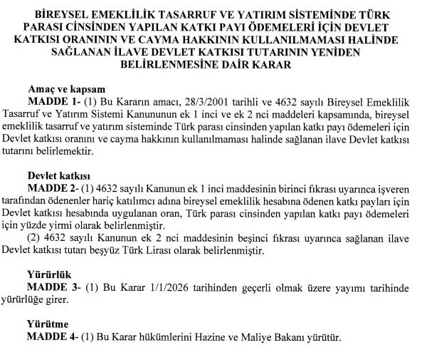 Resmi Gazete’de yayımlanan Cumhurbaşkanı Kararı ile Bireysel Emeklilik Sistemi’nde (BES) yüzde 30 olarak uygulanan devlet katkısı yüzde 20’ye düşürülecek. Karar yayımı itibari ile geçerli olacak ve hükümlerini Hazine ve Maliye Bakanlığı yürütecek.