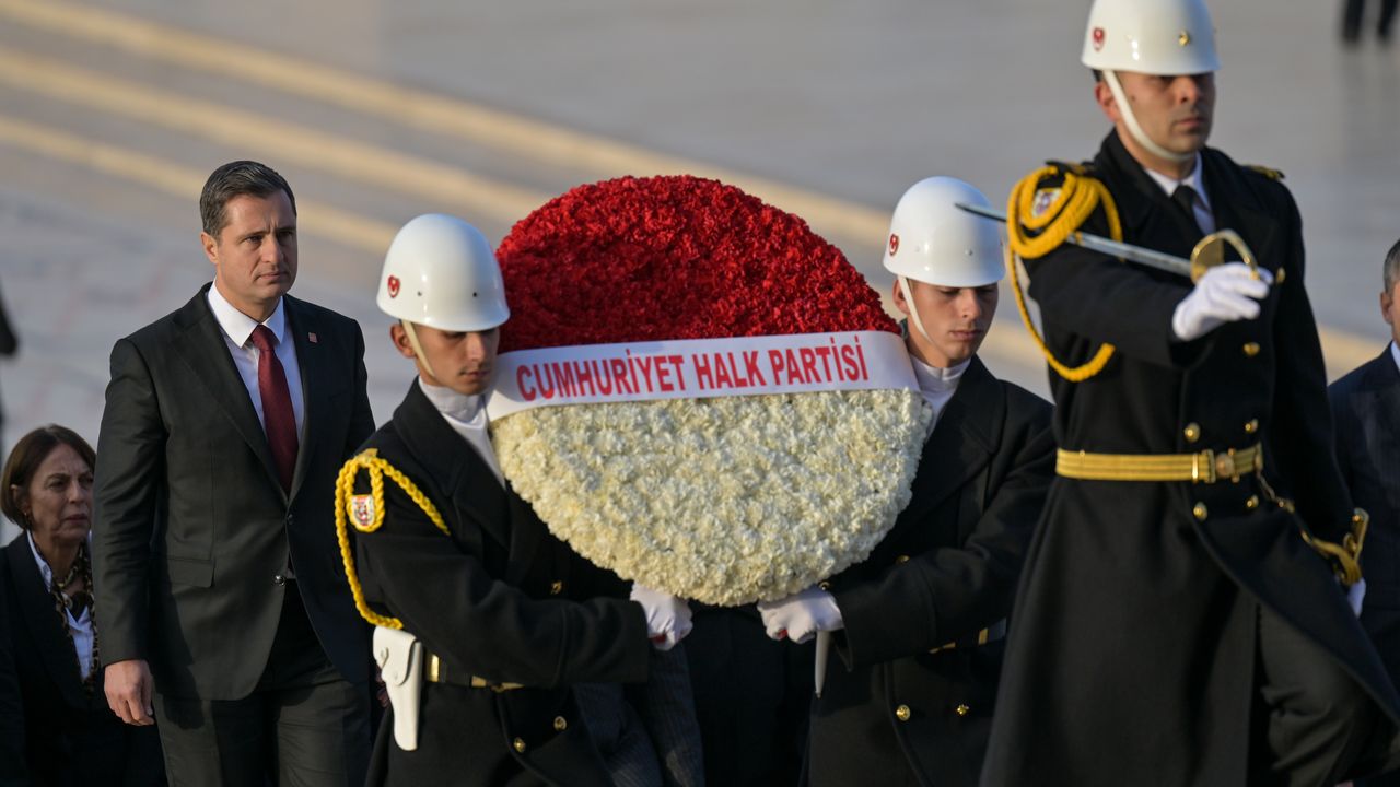 Kırmızı ve beyaz karanfillerden oluşan çelengin mozoleye sunulmasının ardından saygı duruşunda bulunuldu.