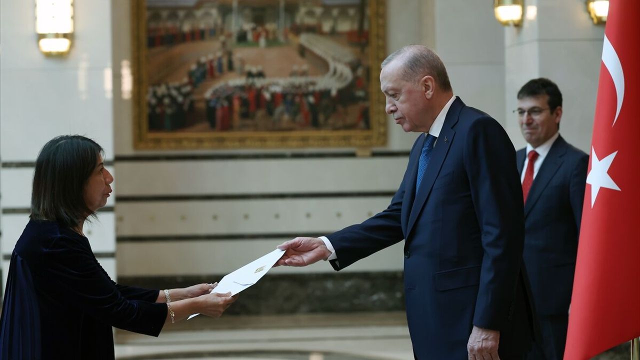 Cumhurbaşkanlığı Külliyesi'ndeki kabulde, Filipinler Büyükelçisi Jamie Ramon Torre Ascalon JR, Kenya Büyükelçisi Anthony Mwaniki Muchiri, Kolombiya Büyükelçisi Yenniffer Edilma Parra Moscoso, Peru Büyükelçisi Luz Betty Caballero Morales ve Rusya Büyükelçisi Sergey Vasilievich Vershinin, Cumhurbaşkanı Erdoğan'a güven mektuplarını sundu.