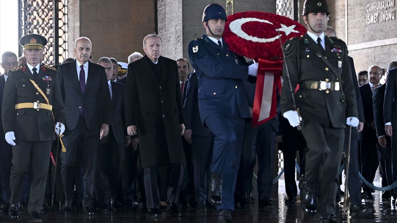 Cumhurbaşkanı Erdoğan'ın, üzerinde ay yıldız bulunan çelengi Atatürk'ün mozolesine bırakmasının ardından saygı duruşunda bulunuldu ve İstiklal Marşı okundu.
