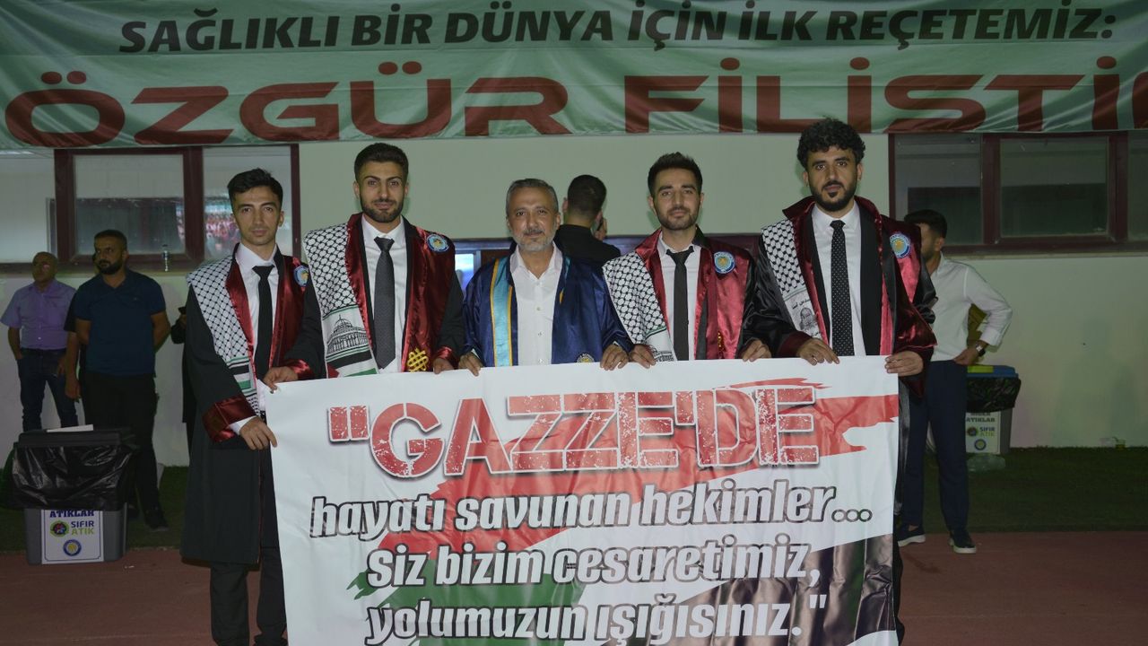 Mezun olan öğrenciler, keplerini gururla fırlatırken, ellerinde taşıdıkları pankartlarla Gazze’de yaşanan insanlık dramına dikkat çekti. “Önce Vicdan Sonra Diploma; Sağlıklı bir Dünya için ilk reçetemiz:Özgür Filistin”, “Filistin bizim onurumuzdur” gibi ifadelerin yer aldığı pankartlar, törende duygu dolu anlara sahne oldu.