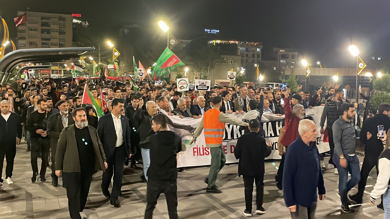 Daha sonra buradan Cumhuriyet Meydanı'na kadar ellerinde Filistin ve Türk bayrakları ile "soykırıma hayır", "Kudüs'e selam direnişe devam", "Siyonist İsrail Filistin’den defol", "katil ABD Orta Doğu'dan defol" yazılı pankartlar ile tekbir getirip İsrail aleyhine slogan attı.