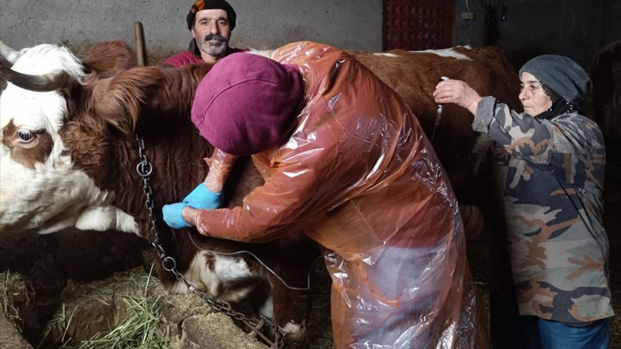 Ulaşım sağlanan köye götürülen veteriner, ineğin tedavisini yaptı.