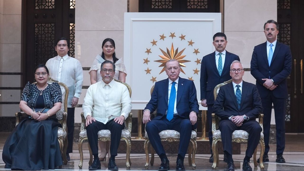 Cumhurbaşkanlığı Külliyesi'ndeki kabulde, Filipinler Büyükelçisi Jamie Ramon Torre Ascalon JR, Kenya Büyükelçisi Anthony Mwaniki Muchiri, Kolombiya Büyükelçisi Yenniffer Edilma Parra Moscoso, Peru Büyükelçisi Luz Betty Caballero Morales ve Rusya Büyükelçisi Sergey Vasilievich Vershinin, Cumhurbaşkanı Erdoğan'a güven mektuplarını sundu.