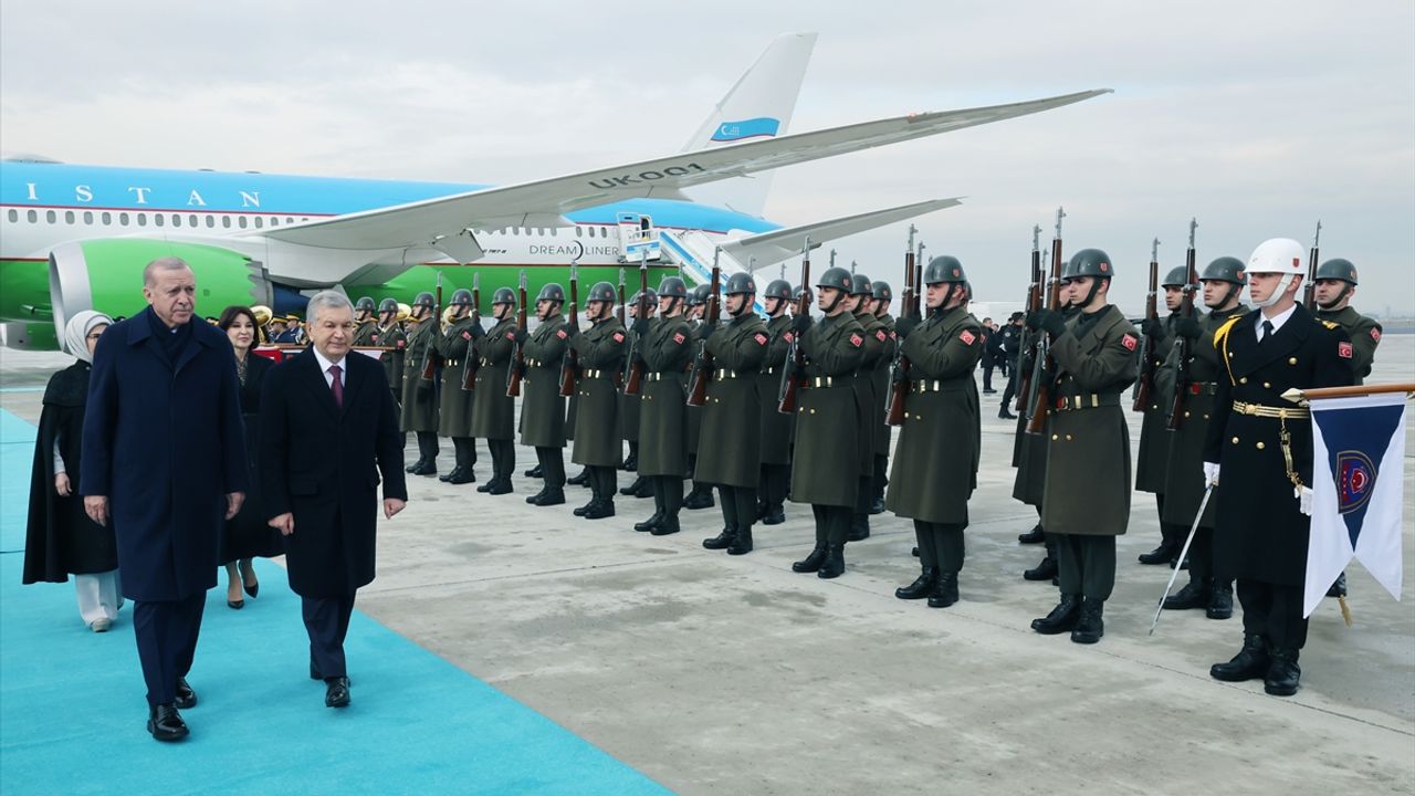 Mirziyoyev'i uçaktan inişinde karşılayan Cumhurbaşkanı Erdoğan'a, eşi Emine Erdoğan, Cumhurbaşkanı Yardımcısı Cevdet Yılmaz ve diğer ilgililer de eşlik etti.