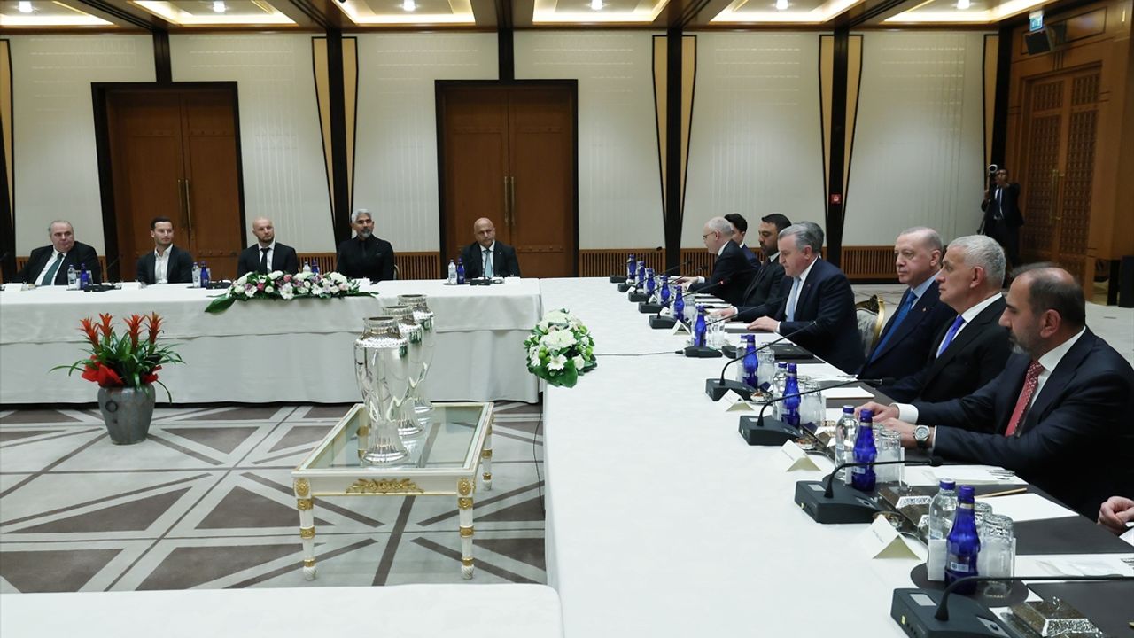 Cumhurbaşkanı Erdoğan, Cumhurbaşkanlığı Külliyesi'nde Gençlik ve Spor Bakanı Osman Aşkın Bak, Cumhurbaşkanı Dış Politika ve Güvenlik Başdanışmanı Akif Çağatay Kılıç, Türkiye Futbol Federasyonu (TFF) Başkanı İbrahim Hacıosmanoğlu ve Süper Lig'e yükselen 3 futbol kulübünün başkanları, teknik heyeti ile oyuncularını kabul etti.