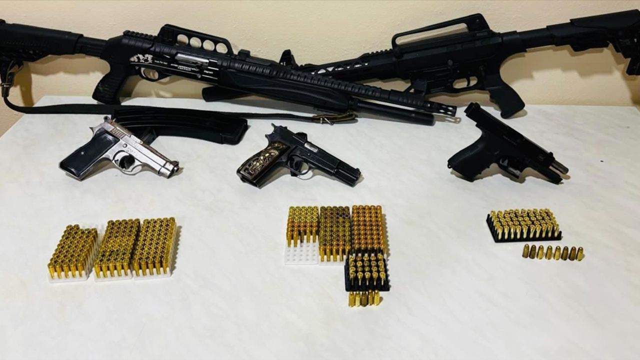 Adreste arama yapan ekipler, odalarda çeşitli yerlere gizlenmiş ruhsatsız 3 tabanca ve 2 av tüfeği ile 362 mermi ele geçirdi.