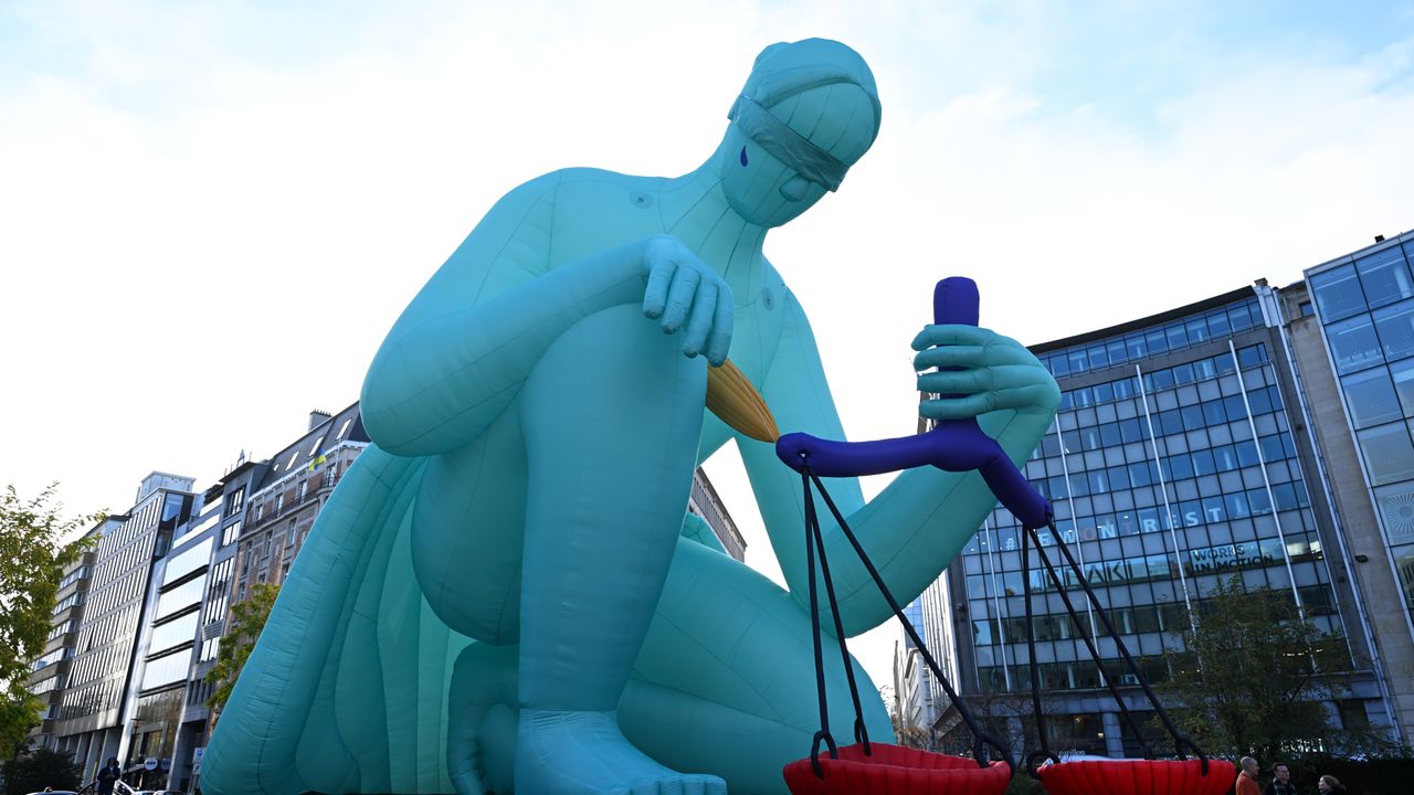 Belçika’nın başkenti Brüksel’de bir grup aktivist, kurumsal hesap verebilirlik yasasındaki adalete ve iklim yükümlülüklerine erişim talebinde bulunmak için AB Konseyi önüne, sırtından bıçaklanan Lady Justice'ın dev balon heykelini getirdi.