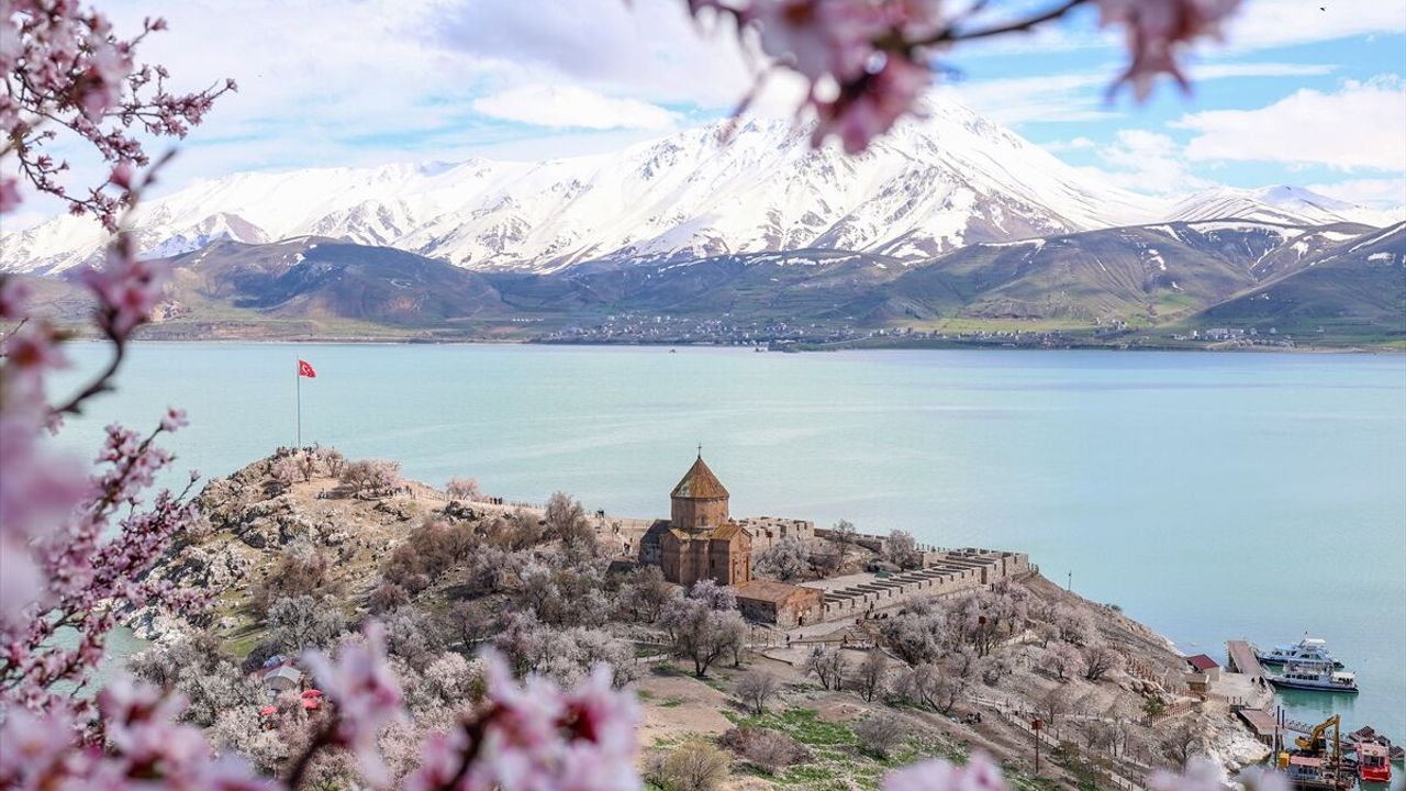 Van'da en çok ziyaret edilen yerlerin başında gelen Van Gölü'ndeki Akdamar Adası, badem ağaçlarının çiçek açmasıyla baharın renklerine büründü.