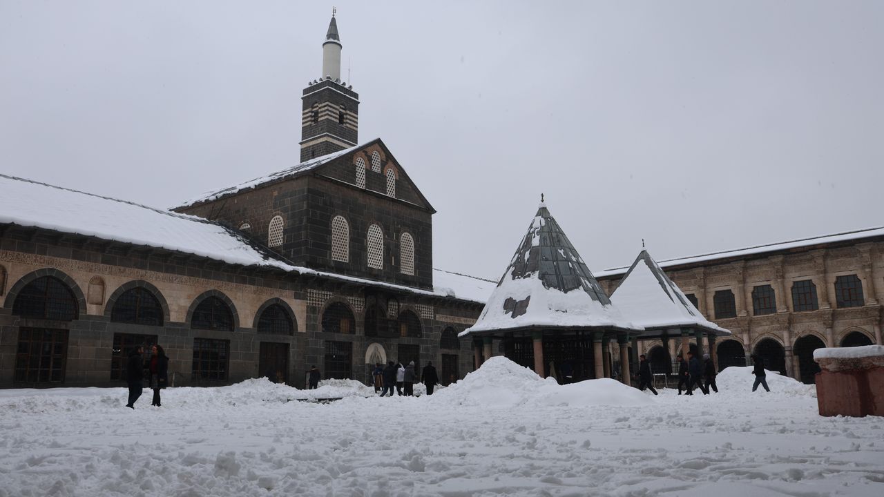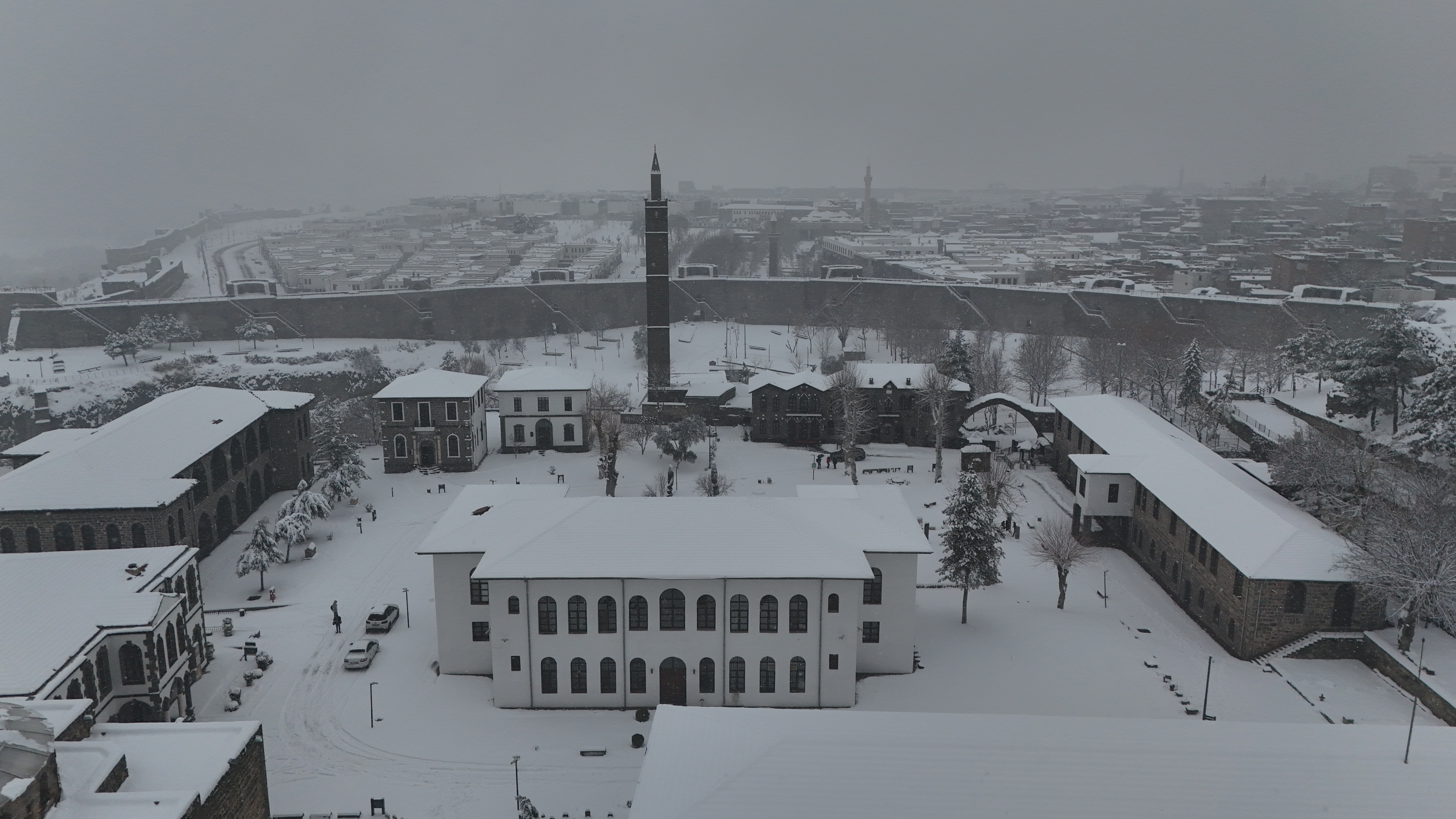 Dünyada 10 bin yıllık tarihiyle en eski ikinci yerleşim yeri olarak bilinen Diyarbakır'ın merkez Sur ilçesi beyaza bürünürken, tarihi yapılar dronla görüntülendi.