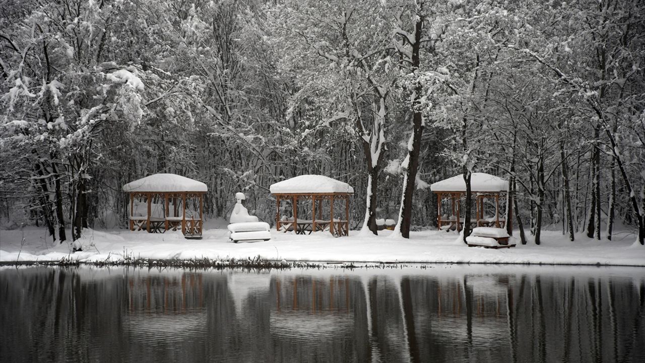 Düzce'nin Kaynaşlı ilçesinde kar yağışının ardından beyaza bürünen Korugöl Tabiat Parkı'nda güzel manzaralar oluştu.