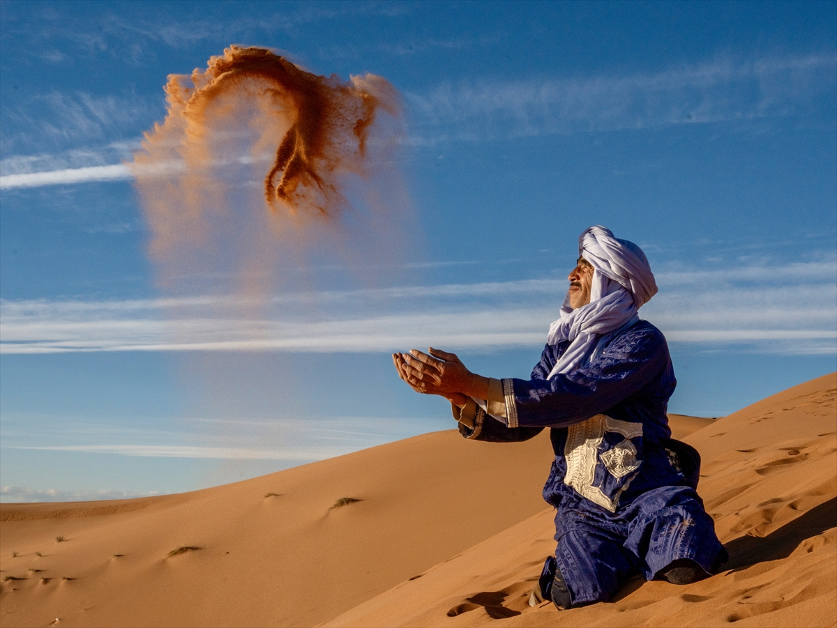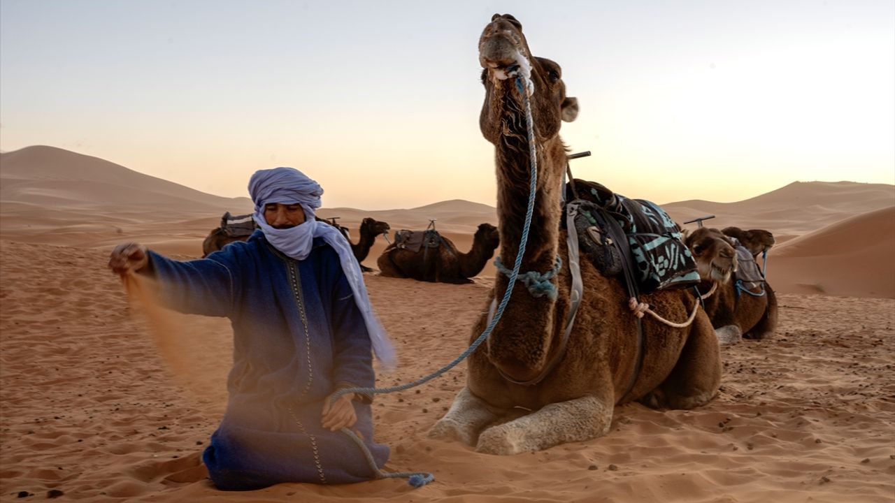 Fas’ın güneydoğusunda bulunan Merzouga bölgesindeki Erg Chebbi'de günlük yaşam görüntülendi. Sahra Çölü'nün batı ucunda yer alan bölgede yaşayan halk, çölü ziyaret eden gruplara develerle rehberlik ederken bu faaliyet yerel halk için önemli bir gelir kaynağı oluşturuyor. Kum çölü olarak sınıflandırılan çölde, gün içinde hava sıcaklığının artmasıyla hareketlilik azalırken akşam saatlerinde yeniden canlanıyor.