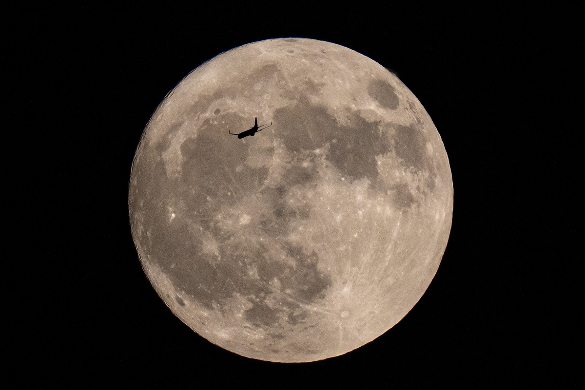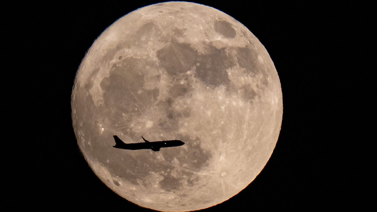 İstanbul'da akşam saatlerinde gökyüzünde beliren dolunay, bir uçak ile birlikte görüntülendi.