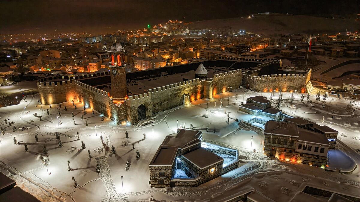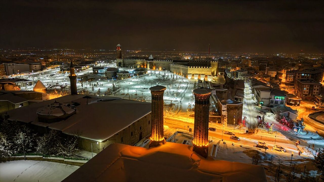 Erzurum'da etkili olan yoğun karın ardından beyaza bürünen kent merkezindeki bazı tarihi yapılar, dronla görüntülendi.