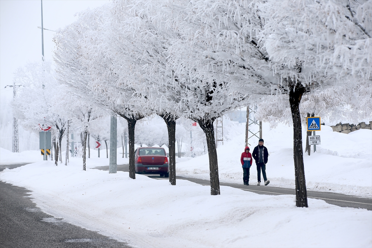 Muş'ta etkili olan kar yağışının ardından kent merkezi beyaza büründü. Soğuk havanın etkili olduğu kentte ağaçlarda kırağı oluştu.