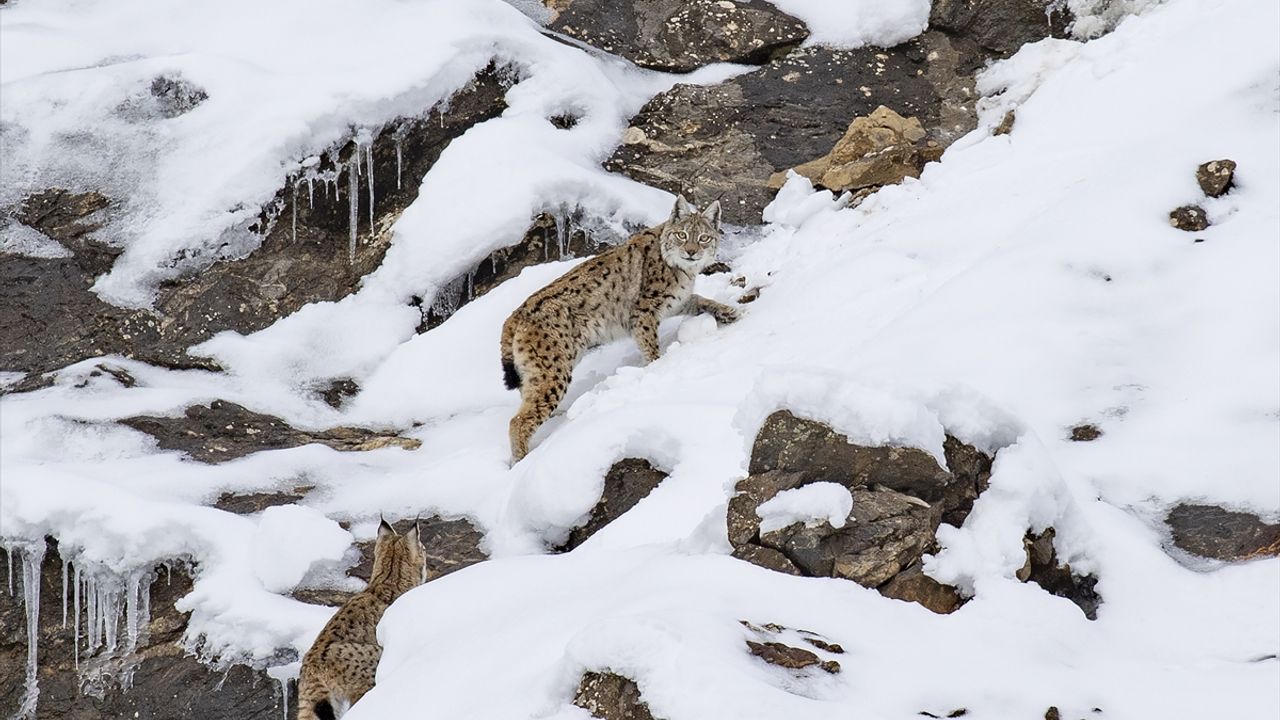 Tunceli'de nesli tükenme tehlikesi altında olan vaşaklar, Munzur Vadisi Milli Parkı'nın karlı dağlarında yiyecek ararken görüntülendi. Uluslararası Doğayı Koruma Birliğinin kırmızı listesinde yer alan vaşaklar, nesli tükenme tehlikesiyle karşı karşıya olduğu için birinci derecede koruma altında bulunuyor.
