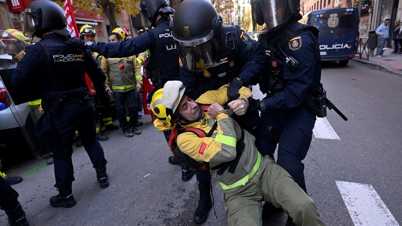 İspanya'nın başkenti Madrid'de süresiz grevde olan orman itfaiyecileri seslerini duyurmak için protesto düzenledi. Maaş zammı ve çalışma şartlarının iyileştirilmesi talebiyle resmi kıyafetleriyle eyleme gelen itfaiyecilere polis müdahale etti.