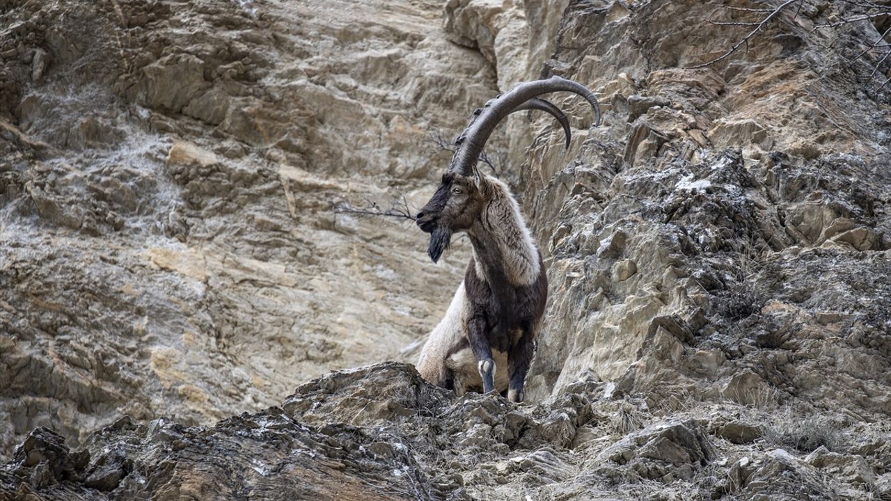 Tunceli'de koruma altındaki yaban keçileri, karla kaplı zirvelerden indikleri alçak kesimlerde beslenirken görüntülendi.