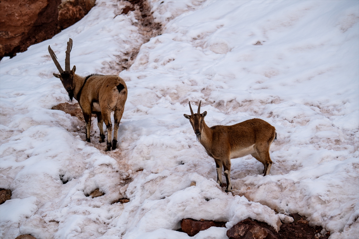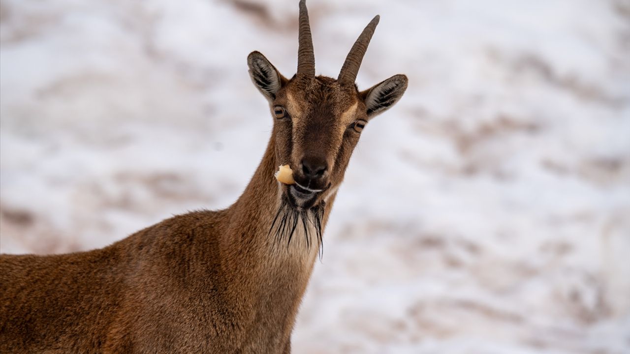 Yaban keçileri karlı bölgede yiyecek ararken görüntülendi!
