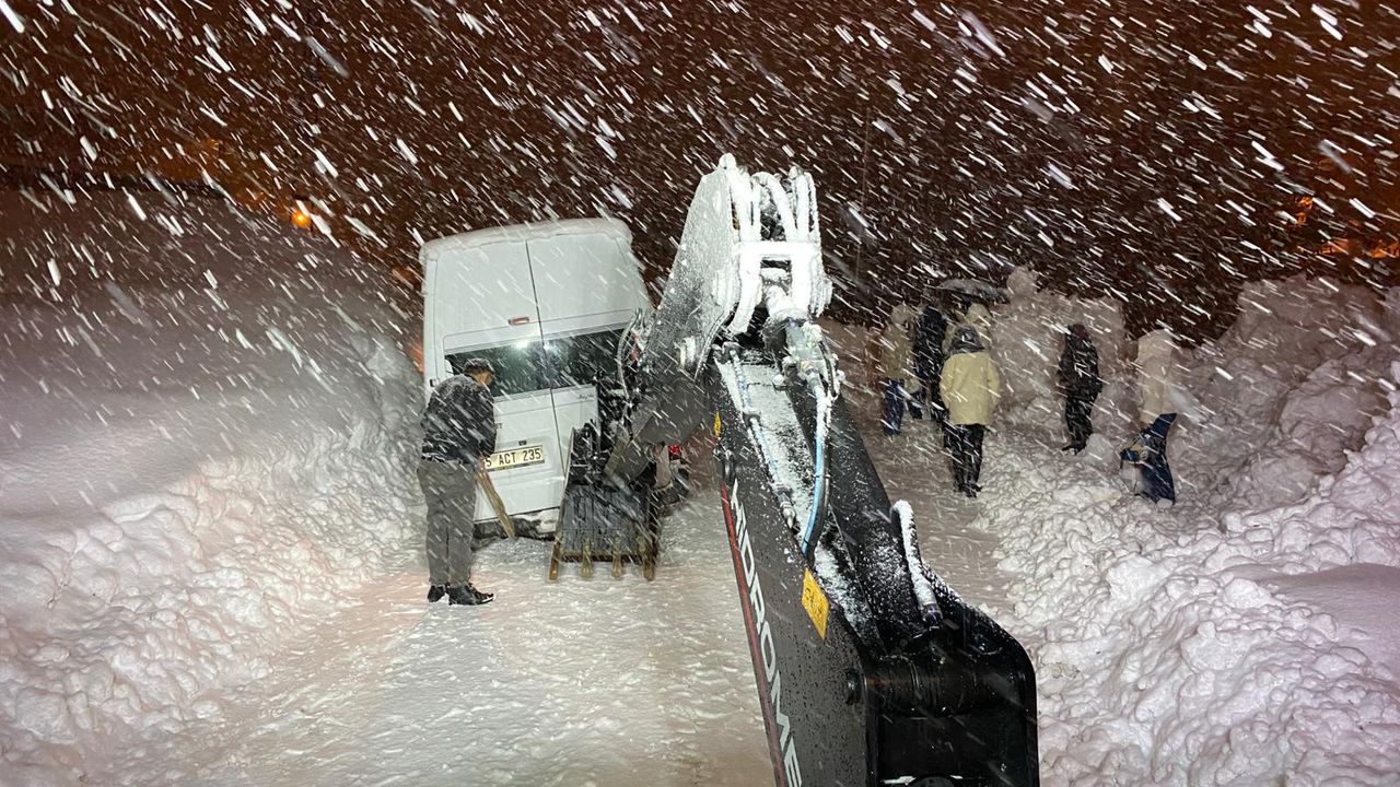 Merzan Mahallesi'nde yoğun kar yağışı ve tipi nedeniyle yolda ilerleyemeyen minibüs sürücüsü, belediyeden yardım talebinde bulundu. İhbar üzerine kısa sürede bölgeye sevk edilen belediye karla mücadele ekipleri, yolu temizledi. Ardından iş makinesi yardımıyla minibüs bulunduğu yerden çıkarıldı.