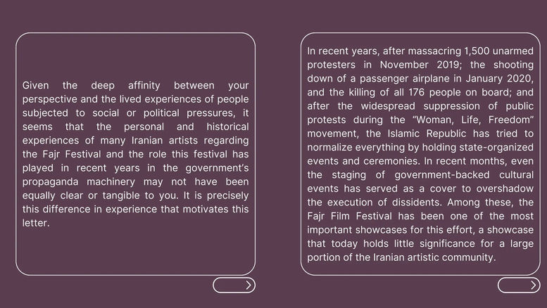 Sizin bakış açınız ile sosyal veya siyasi baskılara maruz kalan insanların yaşadığı deneyimler arasındaki derin benzerlik göz önüne alındığında, birçok İranlı sanatçının Fajr Festivali hakkındaki kişisel ve tarihsel deneyimlerinin ve bu festivalin son yıllarda hükümetin propaganda mekanizmasındaki rolünün size aynı derecede açık veya somut olmamış olabileceği anlaşılmaktadır. Bu mektubu yazmamıza neden olan şey de tam olarak bu deneyim farkıdır. Son yıllarda, Kasım 2019'da 1.500 silahsız protestocunun katledilmesinden; Ocak 2020'de bir yolcu uçağının düşürülmesi ve uçaktaki 176 kişinin tamamının öldürülmesinden; ve "Kadın, Yaşam, Özgürlük" hareketi sırasındaki yaygın protesto baskısından sonra, İslami Cumhuriyet devletin organize ettiği etkinlikler ve törenler düzenleyerek her şeyi normalleştirmeye çalışmıştır. Son aylarda, hükümet destekli kültürel etkinliklerin sahnelenmesi bile muhaliflerin idamlarının üzerini örtmek için bir kılıf görevi görmüştür. Bunlar arasında, Fajr Film Festivali, İran sanat camiasının büyük bir kısmı için bugün pek bir anlam ifade etmeyen bir vitrin olmasına rağmen, bu çabanın en önemli araçlarından biri olmuştur.