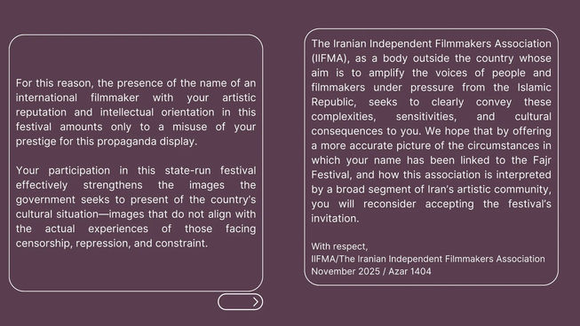 Bu nedenle, sizin sanatsal itibarınız ve entelektüel yöneliminizdeki uluslararası bir sinemacının isminin bu festivalde yer alması, prestijinizin bu propaganda gösterisi için kötüye kullanılması anlamına gelmektedir. Devlet tarafından yönetilen bu festivale katılımınız, hükümetin ülkenin kültürel durumunu sunmaya çalıştığı imajları (Sansür, baskı ve kısıtlamalarla karşı karşıya kalanların gerçek deneyimleriyle örtüşmeyen imajları) etkili bir şekilde güçlendirmektedir. İran Bağımsız Sinemacılar Derneği (IIFMA) olarak, amacı İslami Cumhuriyet'in baskısı altındaki insanların ve sinemacıların seslerini yükseltmek olan yurt dışı merkezli bir kuruluş olarak, bu karmaşıklıkları, hassasiyetleri ve kültürel sonuçları size açıkça iletmeyi amaçlıyoruz. Umarız, isminizin Fajr Festivali'ne nasıl bağlandığına ve bu ilişkinin İran sanat camiasının geniş bir kesimi tarafından nasıl yorumlandığına dair daha doğru bir resim sunarak, festivalin davetini kabul etme kararınızı yeniden gözden geçirirsiniz.