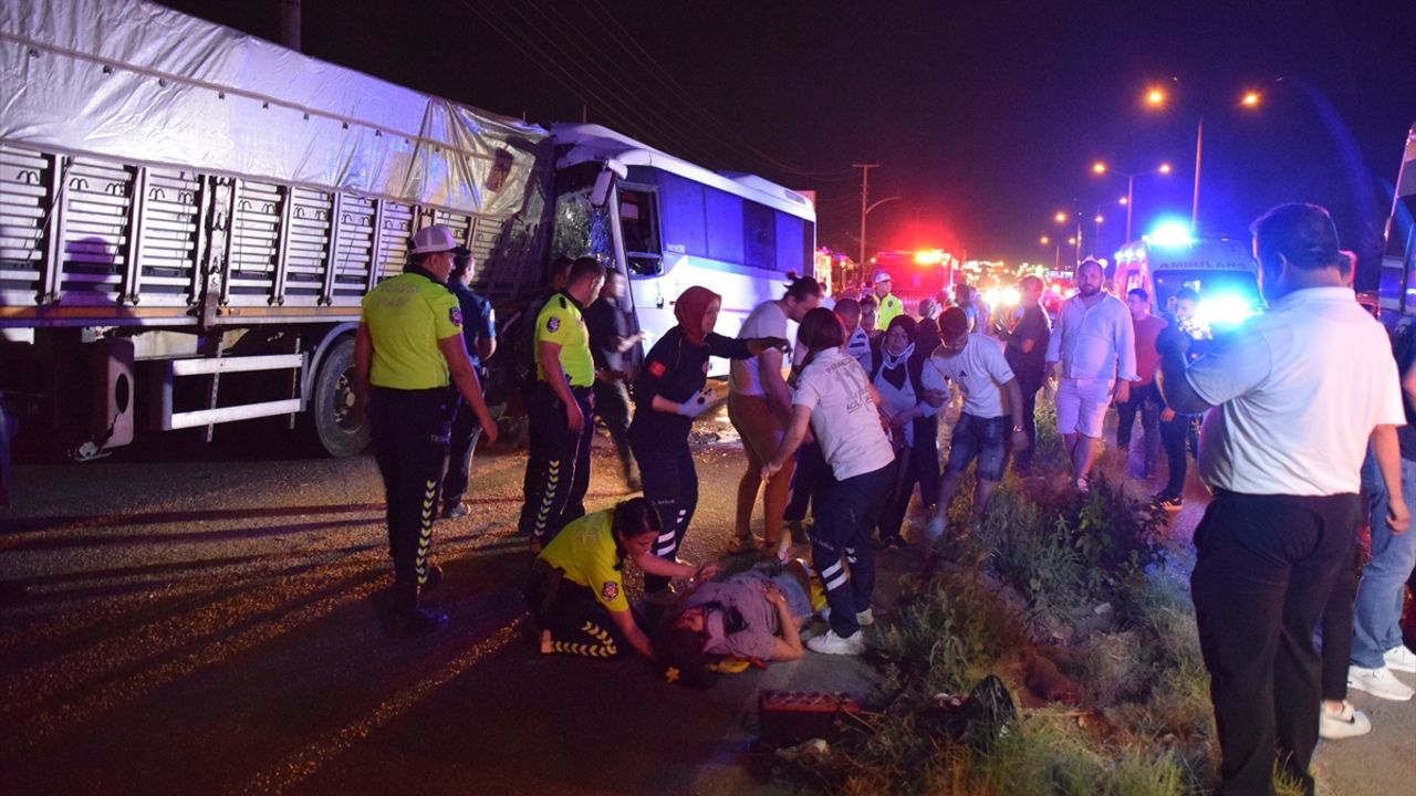 Manisa'nın Turgutlu ilçesinde işçi servisinin park halindeki tıra arkadan çarpması sonucu 5'i ağır 20 kişi yaralandı.
