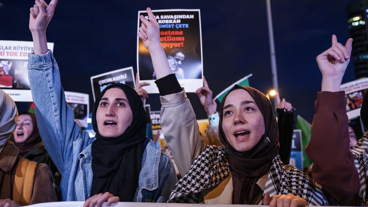 Ellerinde Filistin ve Türk bayrakları ile dövizler taşıyan gruptakiler, İsrail'in Gazze'deki el-Ehli Baptist Hastanesi'ni bombalamasını protesto etti.