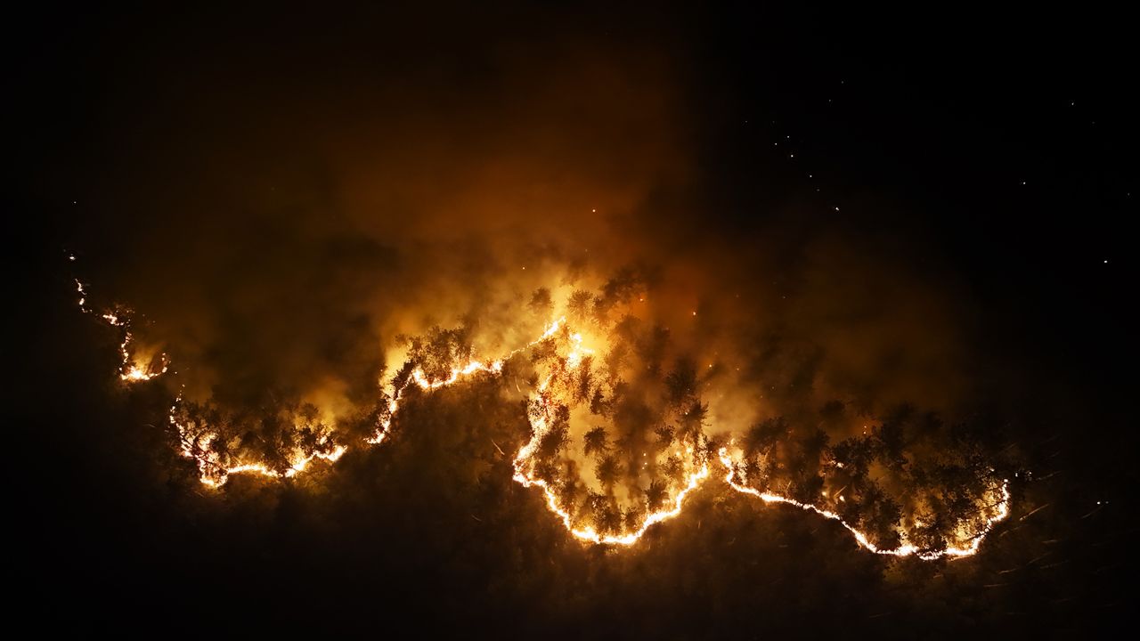 Öte yandan bölgede devam eden yangın dron ile görüntülendi.