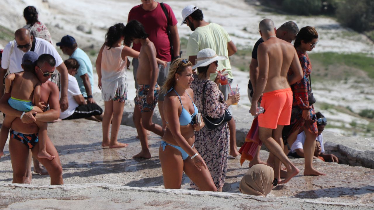 Denizli'de 40 dereceyi bulan kavurucu sıcaklardan kaçan yerli ve yabancı turistler, UNESCO Dünya Miras Listesi’nde yer alan beyaz cennet Pamukkale’ye akın etti.