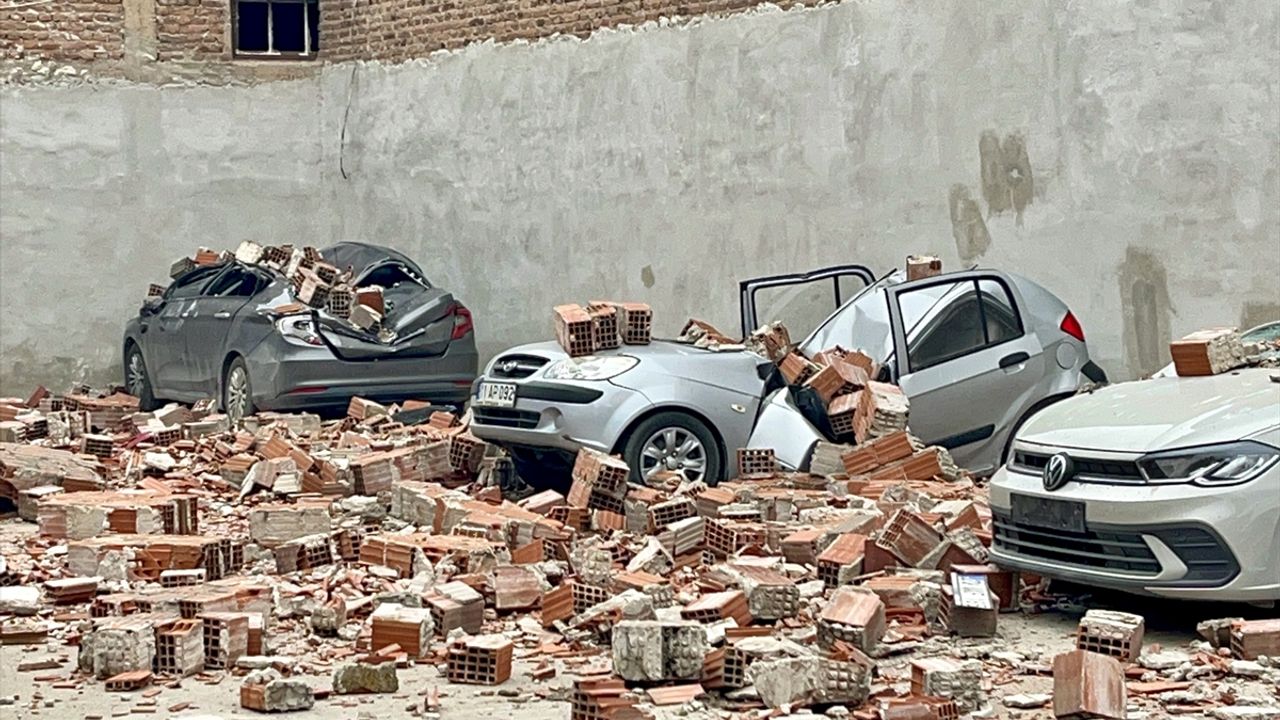 Eskişehir'de kuvvetli rüzgar nedeniyle metruk binanın çatı duvarının devrilmesi sonucu park halindeki 6 araçta hasar oluştu.