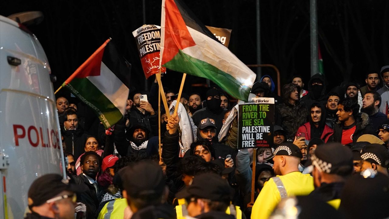 Filistin Dayanışma Kampanyası, Savaşı Durdur Koalisyonu, Britanya Müslümanlar Derneği, Al-Aqsa Dostları, Keşmir Dayanışma Kampanyası ve Britanya'daki Filistin Forumu tarafından düzenlenen protestoya katılanlar Villa Park Stadı'nın önünde toplandı.