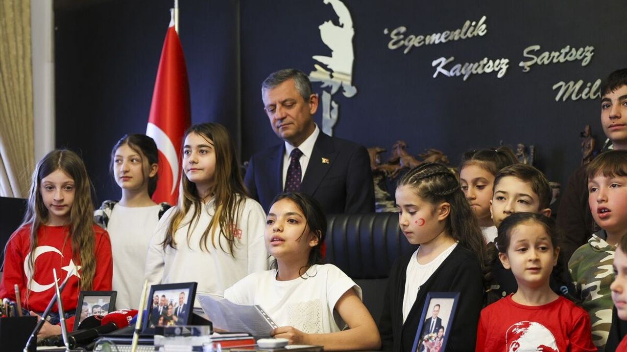 Çocuklarla tek tek tokalaşan Özel, daha sonra koltuğunu Hatay'ın Samandağ ilçesinden gelen 5. sınıf öğrencisi depremzede Elisa Dok'a devretti.