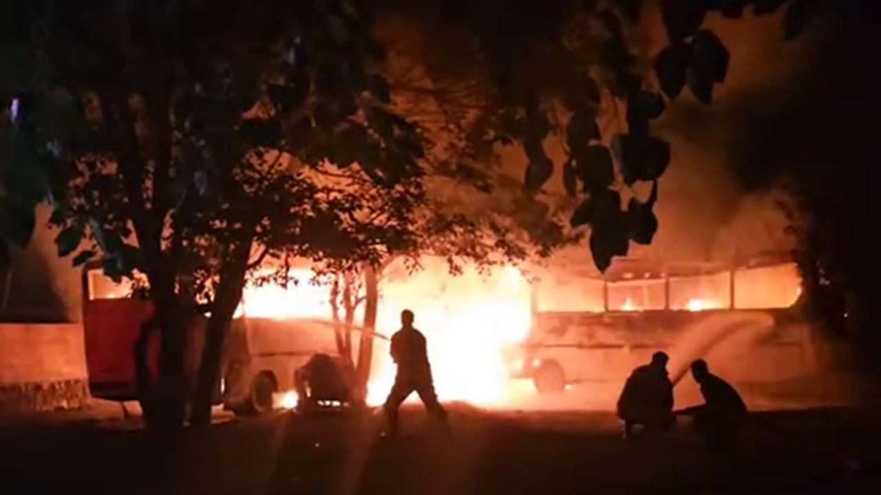 Hatay'da park halindeyken alevlere teslim olan 2 midibüs kullanılmaz hale geldi.