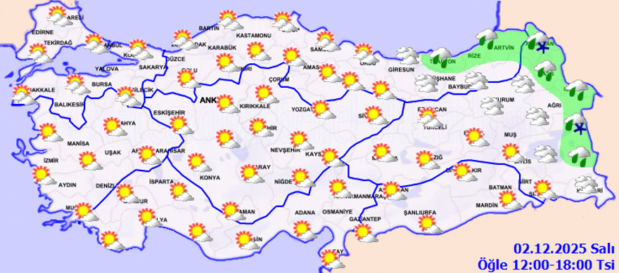 Parçalı ve çok bulutlu. Orta Karadeniz kıyıları ve Doğu Karadeniz'in yağışlı geçeceği tahmin ediliyor. Genellikle yağmur ve sağanak, Doğu Karadeniz'in iç kesimlerinin yükseklerinde karla karışık yağmur ve kar şeklinde olacağı tahmin ediliyor.