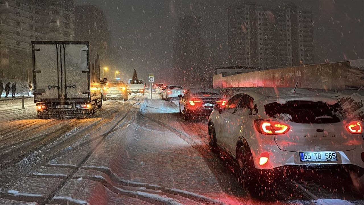 Akşam saatlerinde şiddetini artıran yağış nedeniyle karla kaplanan yollarda kış lastiği ve zinciri bulunmayan araçlar zorlukla ilerliyor.