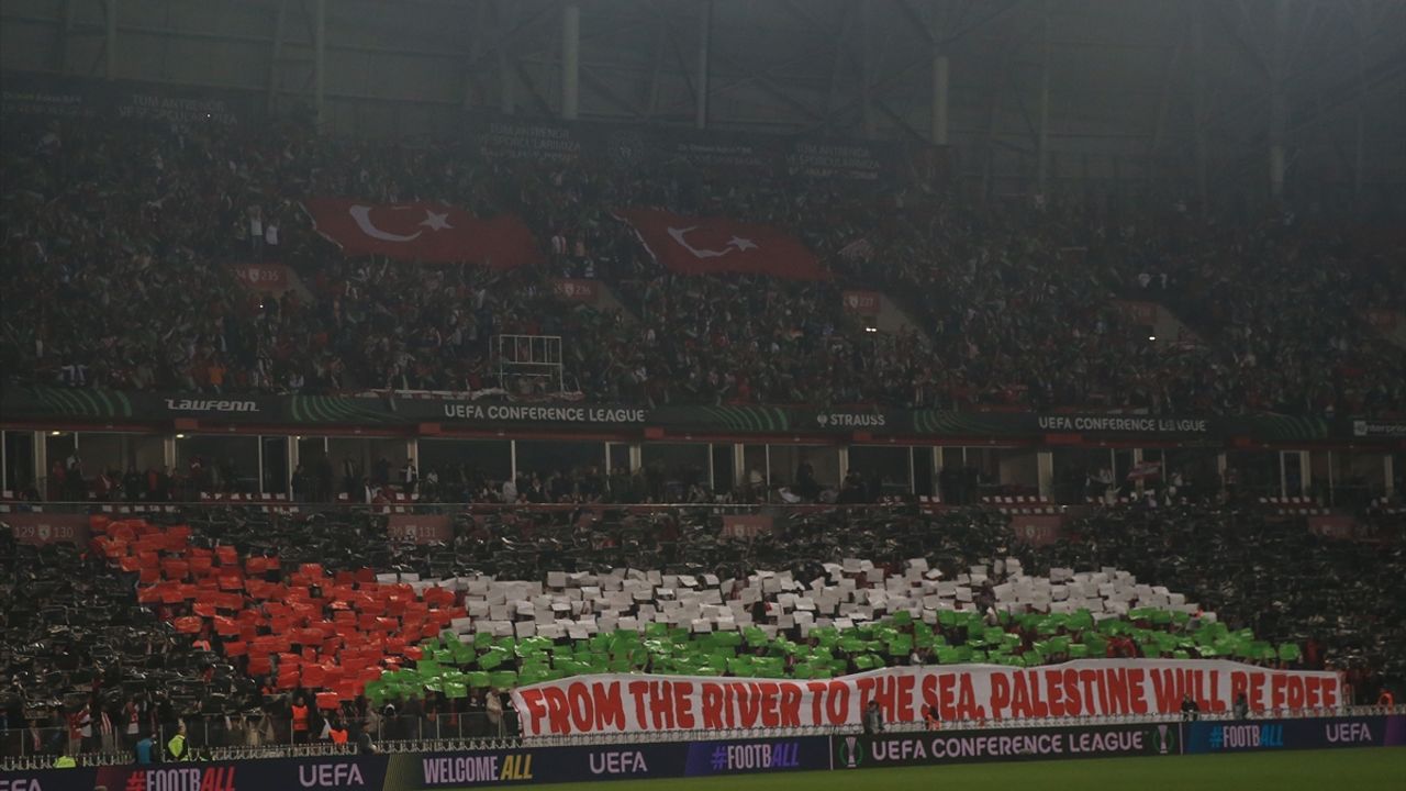 Stadyumun tamamında kartonlarla Filistin bayrağı oluşturan taraftarlar İngilizce, "Nehirden denize kadar Filistin özgür olacak" ifadesinin yazılı olduğu pankart açtı.
