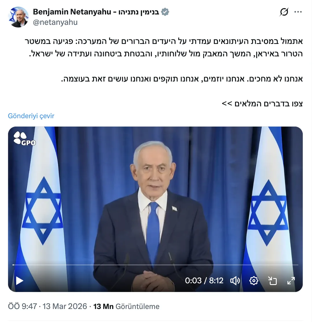 Netanyahu'nun 13 Mart tarihli açıklamasının yapay zekâyla oluşturulduğu