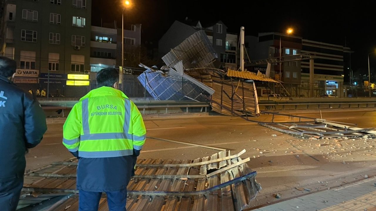 Bursa’da etkisini gösteren şiddetli lodos gece saatlerinde de hız kesmedi. 3 katlı bir binanın çatısı ise fırtınanın etkisiyle uçup metro güzergahı ve anayola düştü.