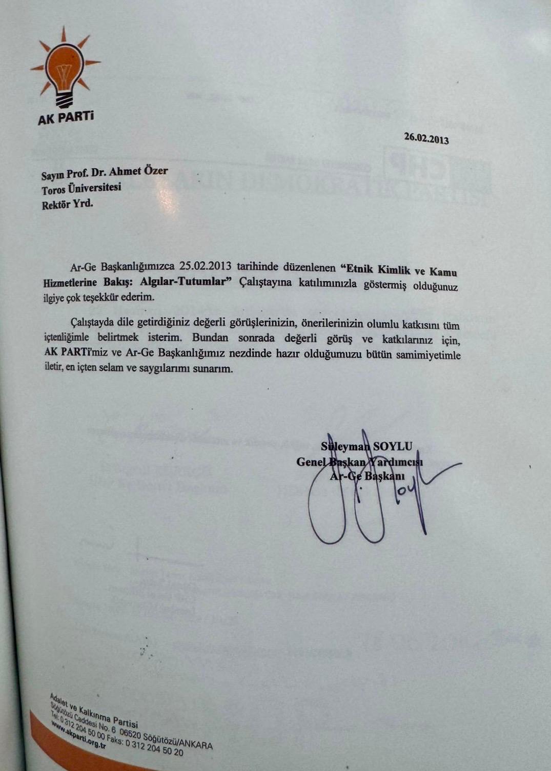 Soylu, mektupta, Özer'e çalıştaya katılımı nedeniyle teşekkür etmiş, "Çalıştayda dile getirdiğiniz değerli görüş ve önerilerinizin olumlu katkısını tüm içtenliğimle belirtmek isterim. Bundan sonra da değerli görüş ve katkılarınız için AK Parti'miz ve Ar-Ge Başkanlığımız nezdinde hazır olduğumuzu bütün samimiyetimle iletir, en içten selam ve saygılarımı sunarım" ifadelerini kullanmış.