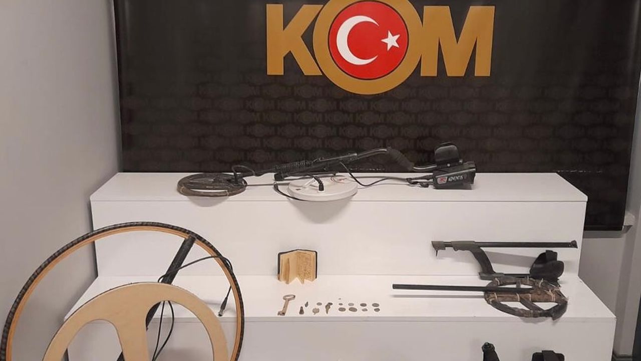 Yapılan aramada 3 adet dijital dedektör, 1 adet el yazması Kur'an-ı Kerim ve 15 adet tarihi eser niteliği taşıyan obje ele geçirildi. Gözaltına alınan şahıs emniyete götürüldü.